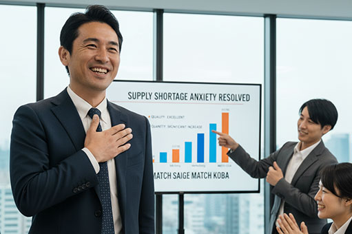 海外調達リスクが高まり、供給不安が常につきまとう状況の中、MATCH KOBAでは国内の豊富で優良なサプライヤーネットワークを活用でき、安心して仕事を受けることが出来るようになった。海外を利用する際は、納期が長くかかるなどのリスクもあったが、国内調達に切り替えることで、納期の短縮と柔軟な調整が実現可能となった。